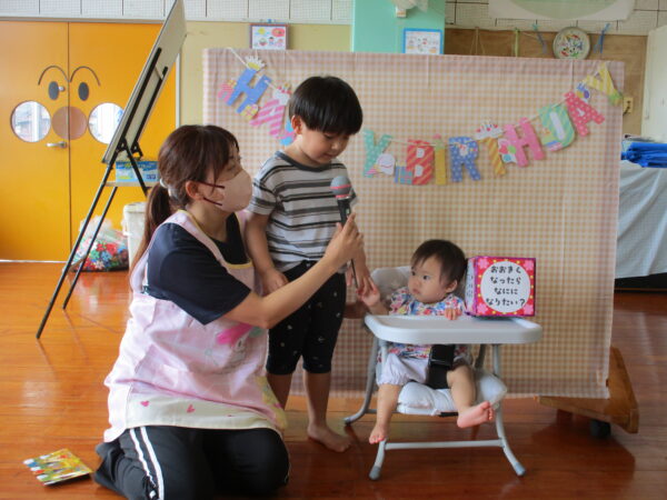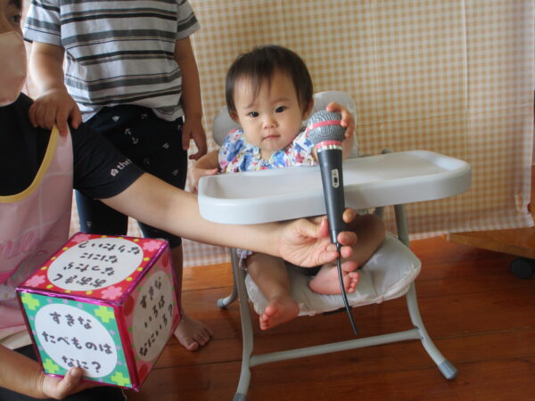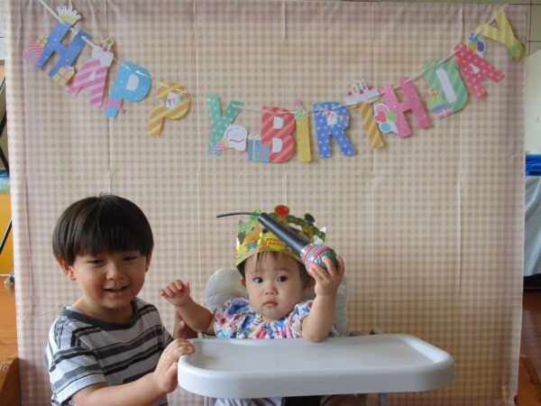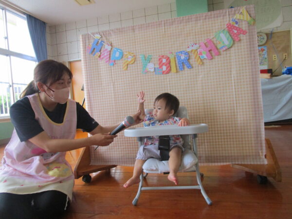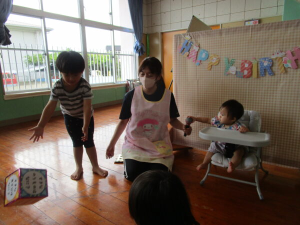 つづきまして、9月のお誕生会の様子です。🎉🍰お誕生月のお友達は、1歳になった桃組のお友達と、5歳になった黄組のお友達がいましたが、5歳になったお友達がお休みでしたので、10月のお誕生会で一緒にお祝いすることにして、この日は1歳のお友達をお祝いすることにしました。お兄ちゃんにサイコロを転がしてもらったり、冠をかぶせてもらったりして、とても嬉しそうで可愛かったですね~👶