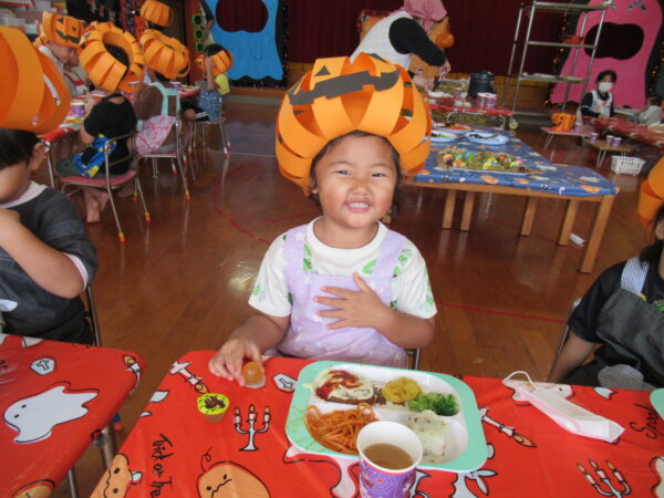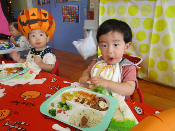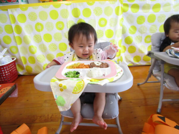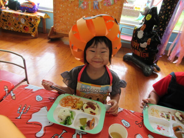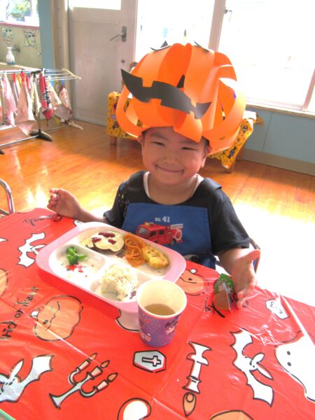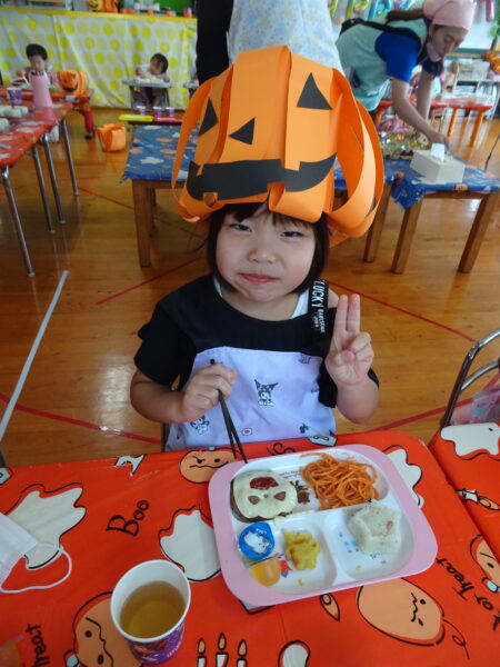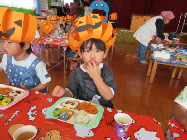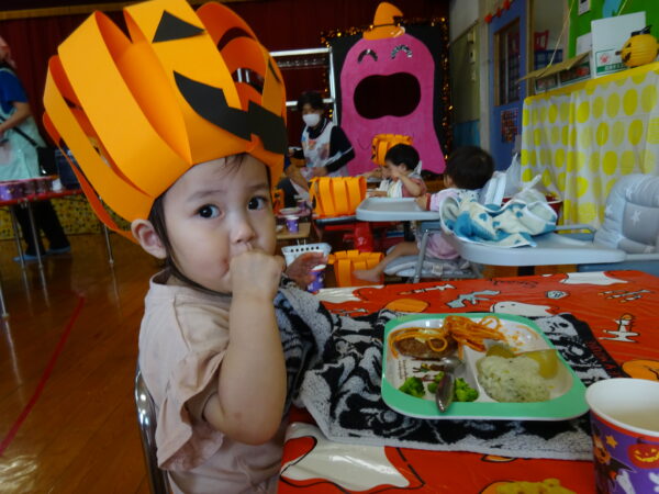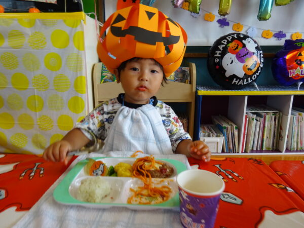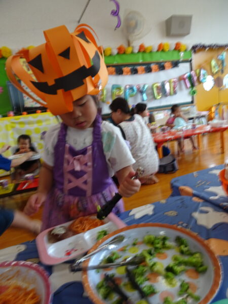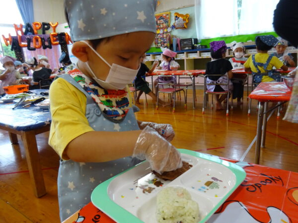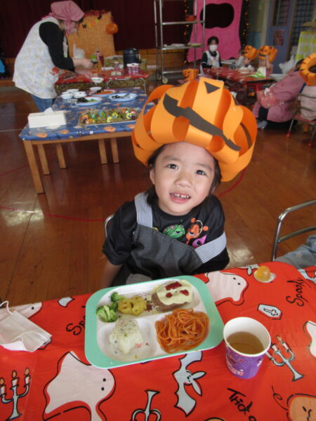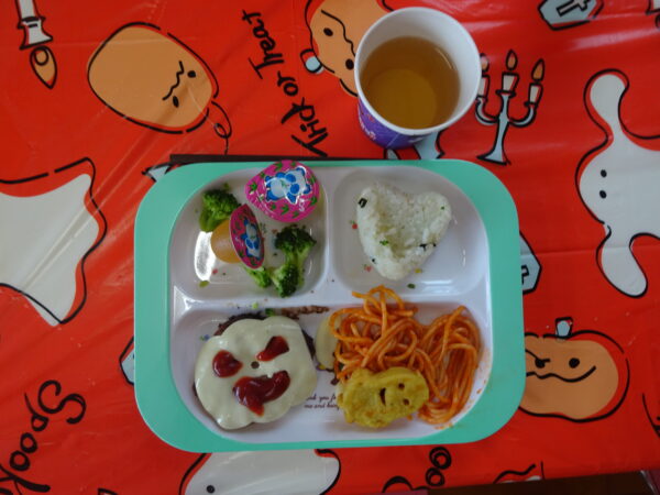 ゲームでは、キャンディーをお化けの口に投げ入れたり、ミイラやオオカミ男の的に当てたり、カボチャの積み上げを競争したりして盛り上がりました🍬そのあとは、おにぎりを作ったり。ハンバーグにチーズで顔のかたちを作ったりして、クッキングとバイキングをみんなで楽しみました。🎉ハロウィンパーティーって楽しいねー🍰🍧