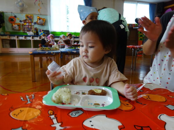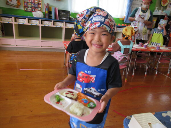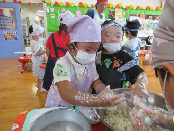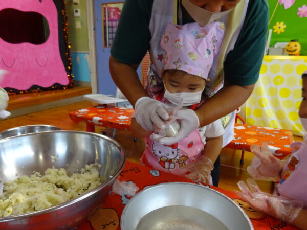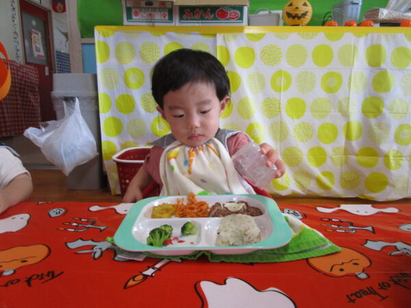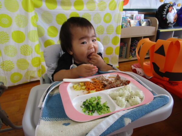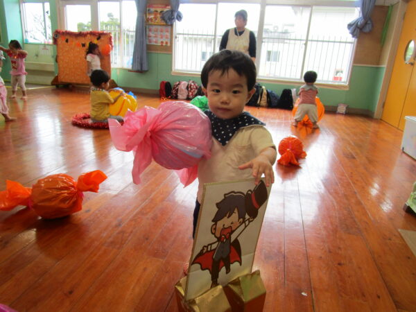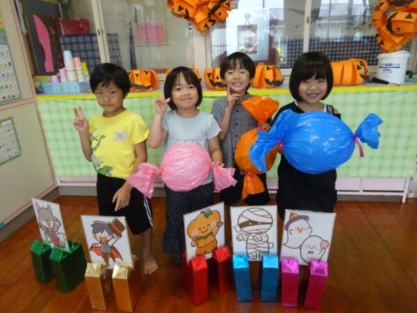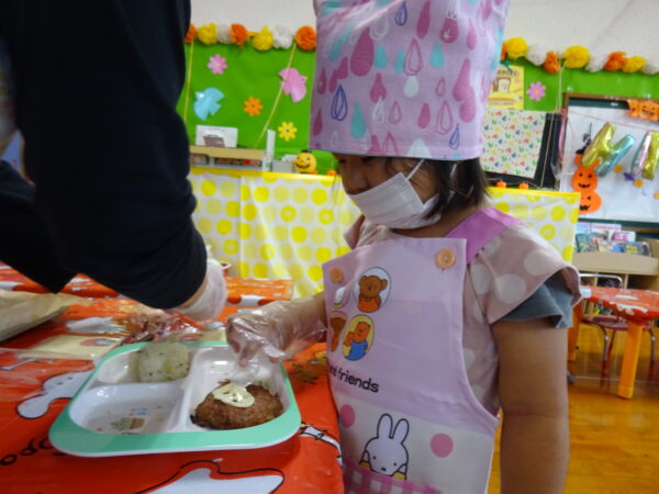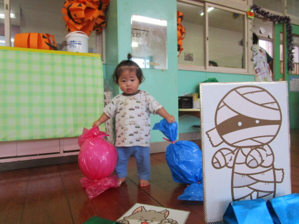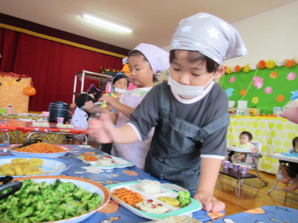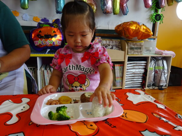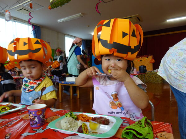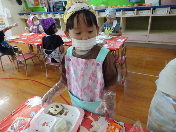 ゲームでは、キャンディーをお化けの口に投げ入れたり、ミイラやオオカミ男の的に当てたり、カボチャの積み上げを競争したりして盛り上がりました🍬そのあとは、おにぎりを作ったり。ハンバーグにチーズで顔のかたちを作ったりして、クッキングとバイキングをみんなで楽しみました。🎉ハロウィンパーティーって楽しいねー🍰🍧