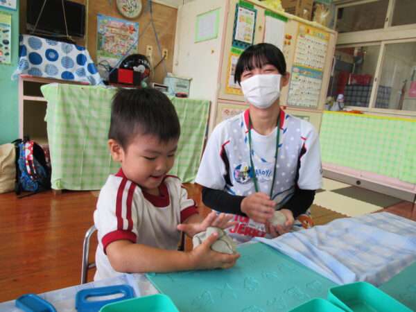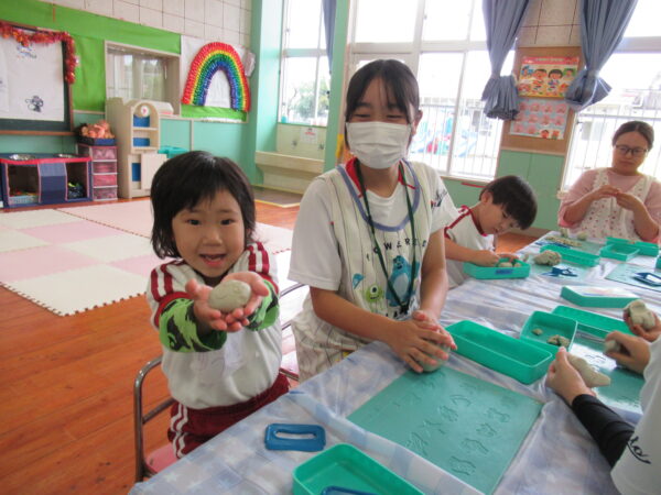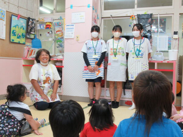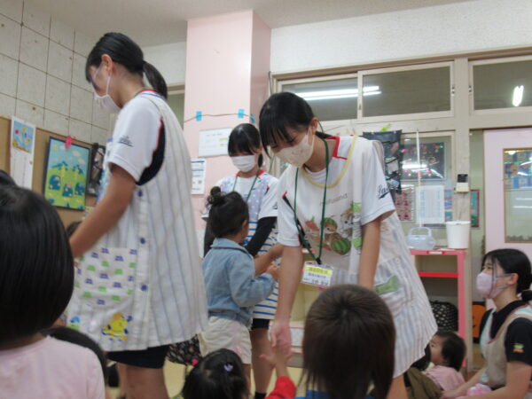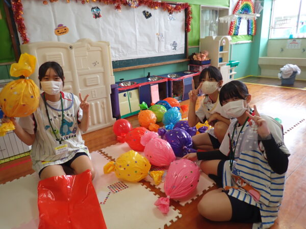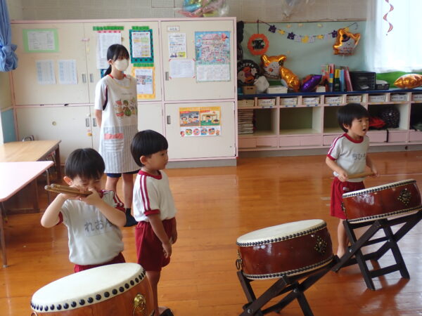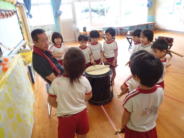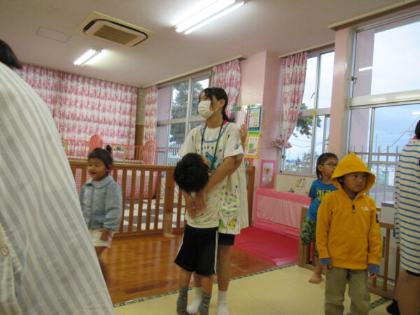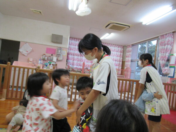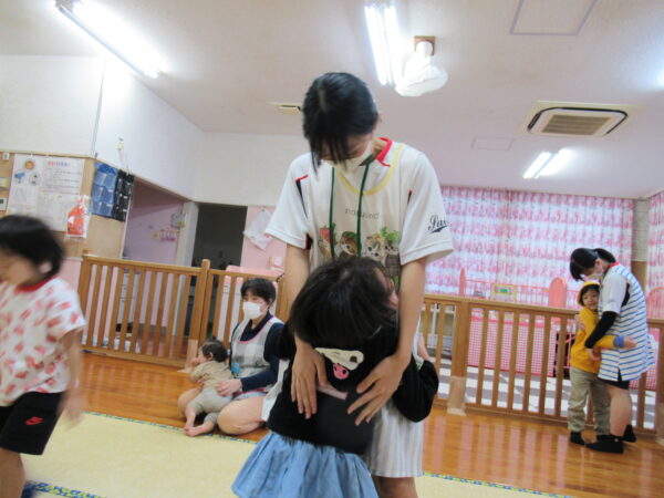 この日は、穂北中学校の2年生女子生徒さん3名が本園で、体験学習を行っていただきました。この日の予定に入っていた和太鼓の指導も見学してもらい、その後、子供たちと一緒にたくさん遊んでもらいました。( ^^) _U~~子供たちは嬉しくて、嬉しくてたまらない様子で3名から離れず、終始テンション爆上がりでした。!(^^)!とても優しく、子供たちの話を聞いてくれて、何かを自ら学び取ろうとする姿に、将来、このような現場で働く姿が見えたような気がして、頼もしさを感じてしまいました。(*^^*)