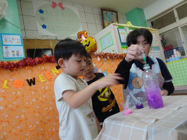 2025年10月27日(月)お誕生会 10月20日(月) 申し訳ありません、先にお知らせしたハロウィンクッキングと同日に、お誕生会も開かれていたにもかかわらず、抜けておりました。ごめんなさい🙇今月は10月の誕生月の園児さんは3名、あと9月にお祝いができなかった園児さん1名、計4名をお祝いしました。混ぜると色が一瞬で変わる不思議な水の実験ショーも面白かったねー🧪⚗️ 子供さんの成長は速いですね~、大切な時間を止めておきたいぐらいですね!!⌛⏰